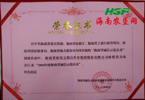 海南農墾網5月22日訊 近日,海墾茶業集團在中共海南省委宣傳部、海南省農業廳、海南省工商行政管理局、海南省國家稅務局、海南省地方稅務局共同開展的“海南省誠信示范企業”創建活動中,被推薦為農業行業“2016年度海南省誠信示范企業”。(陸和)