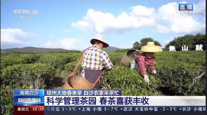 1月28日海墾熱作旗下白沙綠茶走進央視《新聞直播間》,瓊州大地春來早,白沙農家采茶忙。