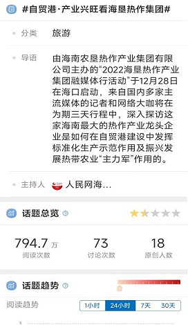 12月29日海墾熱作集團攜手人民網、央視網和一眾網絡大V啟動“產業興旺看海墾熱作集團”行動,三天兩晚走遍熱作基地。期間原創文章50余篇,兩次在人民網官網首頁推薦并獲英文版轉發,人民網微博瀏覽量近800萬次,全網曝光近億人次。