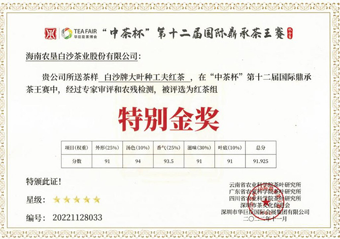 2022年11月白沙牌大葉種工夫紅茶榮獲“中茶杯”第十二屆國際鼎承茶王賽特別金獎