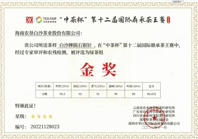 2022年11月白沙牌隕石銀針榮獲“中茶杯”第十二屆國際鼎承茶王賽金獎