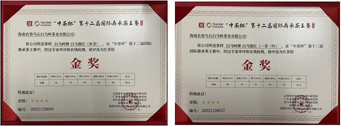 2022年11月白馬駿紅(單芽)、(一芽一葉)榮獲第十二屆“中茶杯”國際鼎承茶王賽金獎。