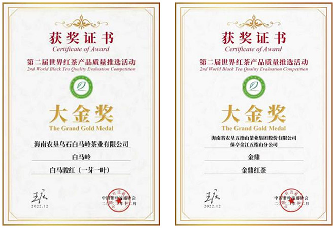 2022年12月白馬駿紅(一芽一葉)、金鼎紅茶榮獲第二屆世界紅茶產品質量推選活動大金獎