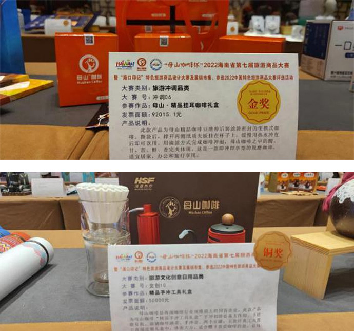 母山精品掛耳咖啡禮盒、精品手沖工具禮盒分別獲得金獎和銅獎。