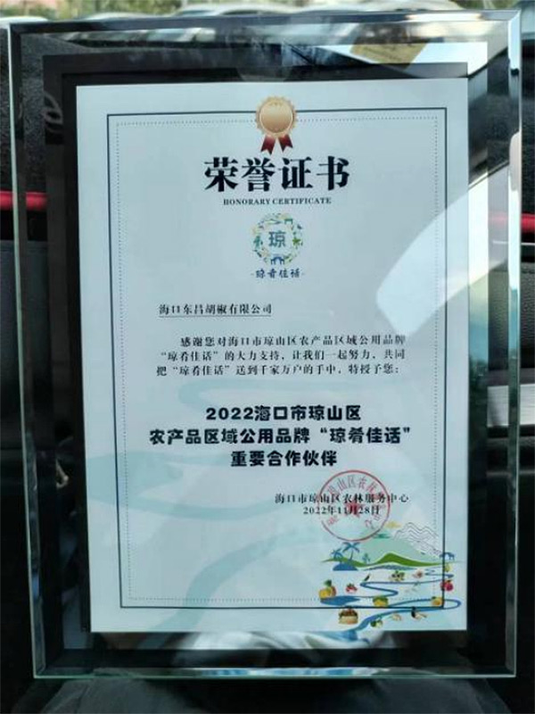 11月28日東昌胡椒公司被評為2022海口市瓊山區農產品區域公用品牌“瓊肴佳話”重要合作伙伴。