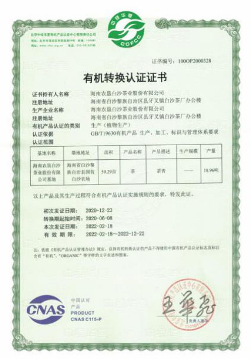 2022年2月榮獲“有機轉換認證證書”