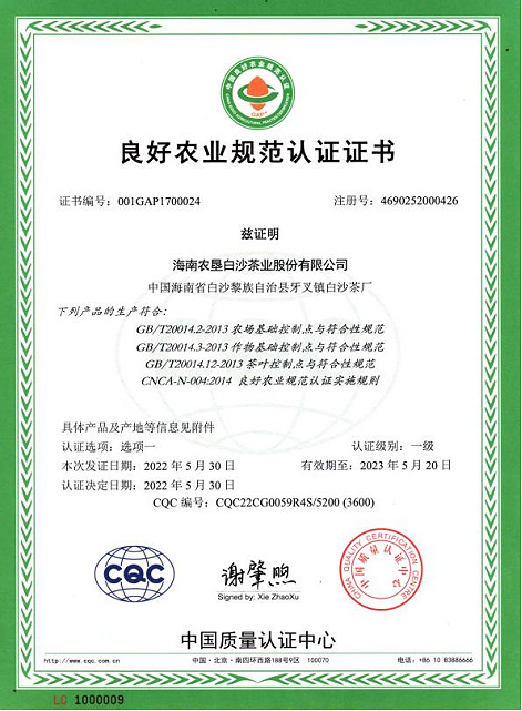 2022年5月榮獲“良好農業規范認證證書”
