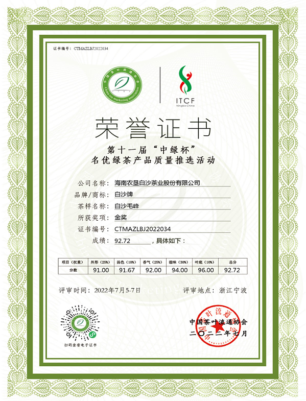 2022年7月白沙毛峰榮獲中國茶葉流通協會第十一屆“中綠杯”金獎