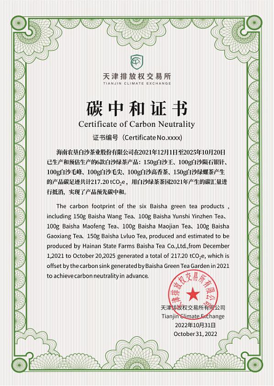 海墾熱作零碳母山咖啡通過可再生能源利用等多種手段,有效降低農產品在生產、物流、包裝、消費等過程中的能源消耗和溫室氣體排放量,達到零碳排放標準,并獲得碳中和證書。