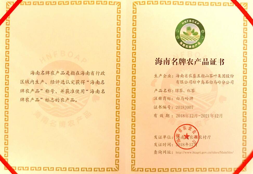 白馬嶺牌紅茶、綠茶被評定為“海南名牌農產品”